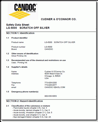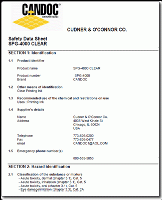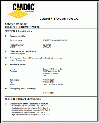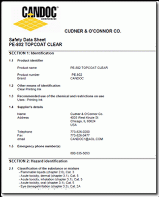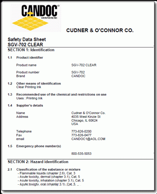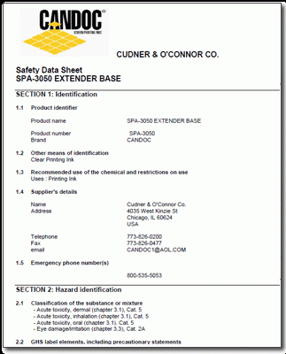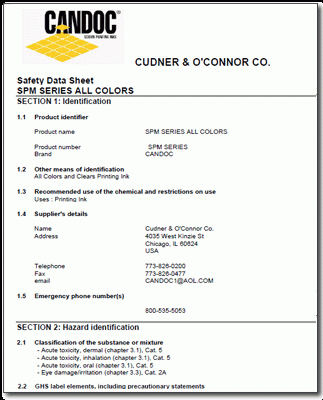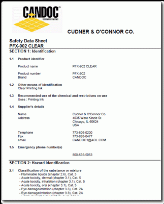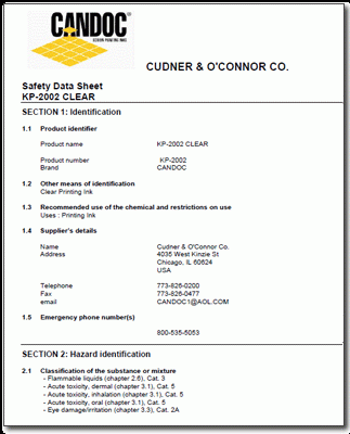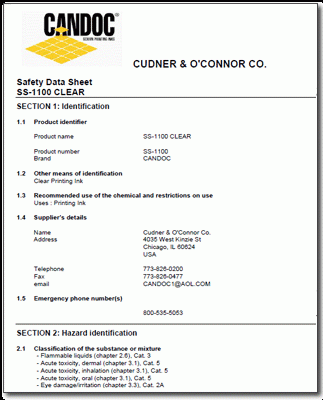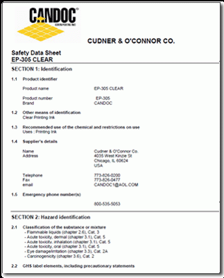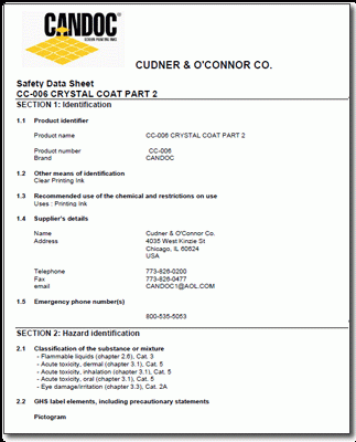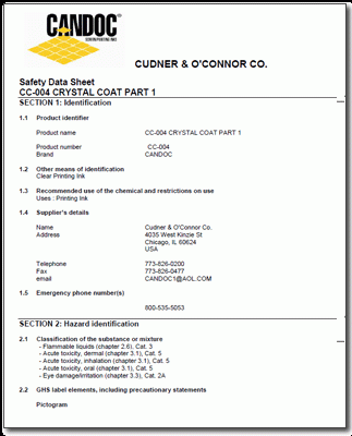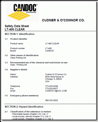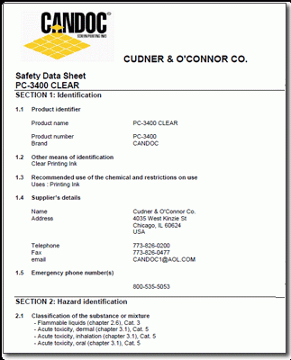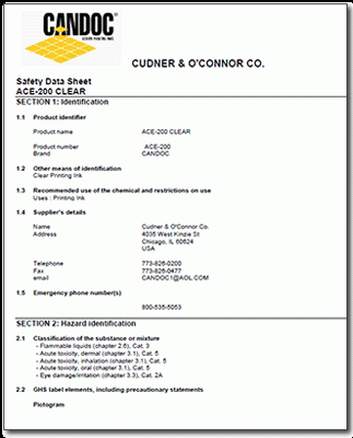 Cudner & O'Connor provides Safety Data Sheets (SDS) for all products. However, because each item has its own SDS it is impossible to include all of them on this website. On this page we provide PDF documents for clears and bases for our most popular ink lines. This information does not include detailed data for colored formulas. If you require an SDS for a specific product, please contact us via the Request Information page or call direct at 773 826-0200 or e-mail inklady61@aol.com.